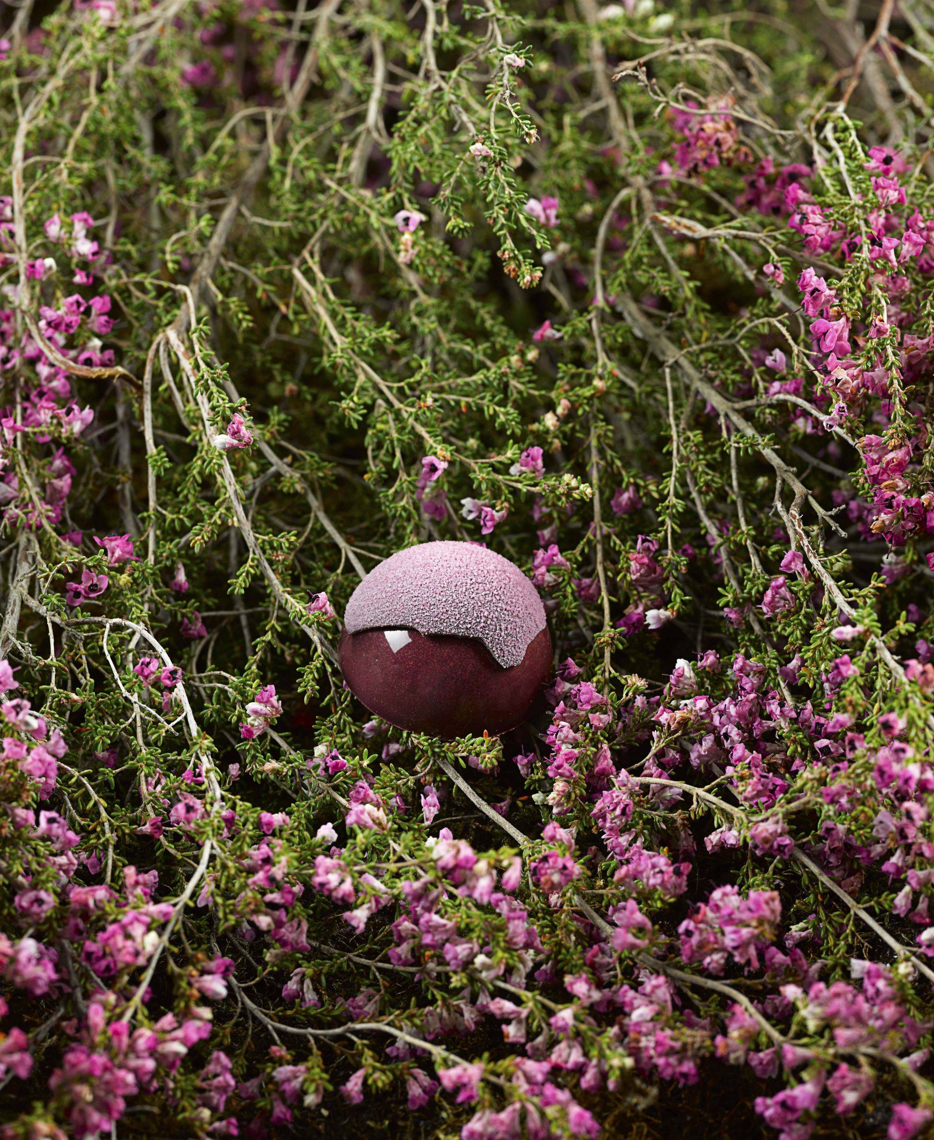 Spray the moulds with purple-coloured, crystallised cocoa butter. Leave to set, then spray again using a solution of bronze powder and 40% alcohol (ratio 1:9). Spray with white cocoa butter for a shiny surface. Cast with Dark Lesuk. Fill mould with ganache. Leave to crystallise overnight, then seal with Dark Lesuk.