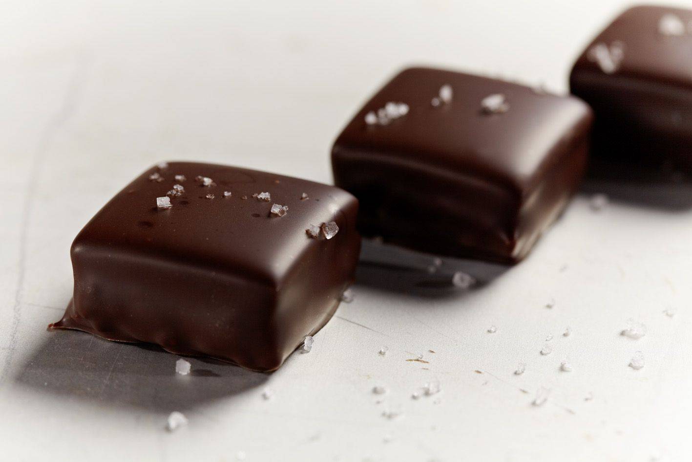 Bring cream, butter, invert sugar and glucose to a boil. Leave to cool to 80°C and pour over couverture solids. Homogenise well with a hand blender and leave to cool to 29°C. Pour the mass between two metal bars to approx. 8 mm. Leave to crystallise overnight and cut with a guitar cutter. Dip into crystallised Dark Madagascar couverture and garnish as desired.